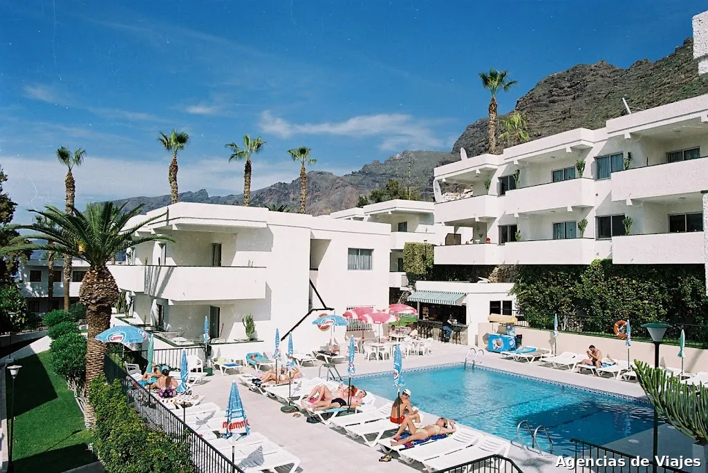 Complejo de apartamentos turísticos en Los Gigantes Tenerife. Amplias zonas de jardín con piscinas para niños y adultos.
